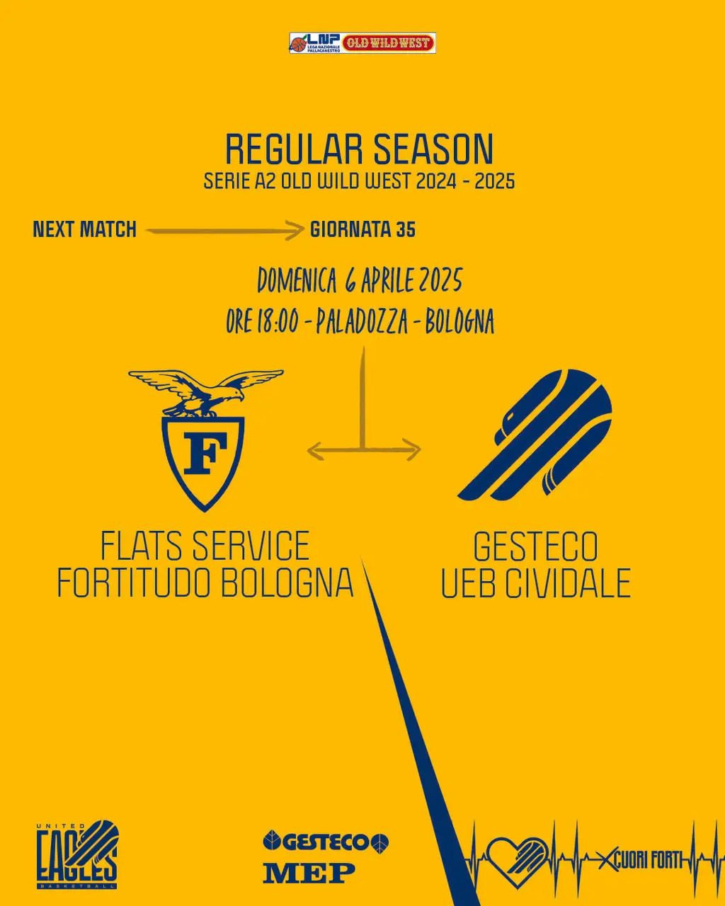 Domenica 6 aprile alle 18.00 la UEB Gesteco Cividale sarà ospite della Flats Service Fortitudo Bologna, nella gara valida per la trentacinquesima e sedicesima giornata di ritorno di stagione regolare di Serie A2 Old Wild West. Arbitreranno Angelo Caforio di Brindisi, Enrico Boscolo Nale di Chioggia (Venezia) e Fabio Bonotto di Ravenna.