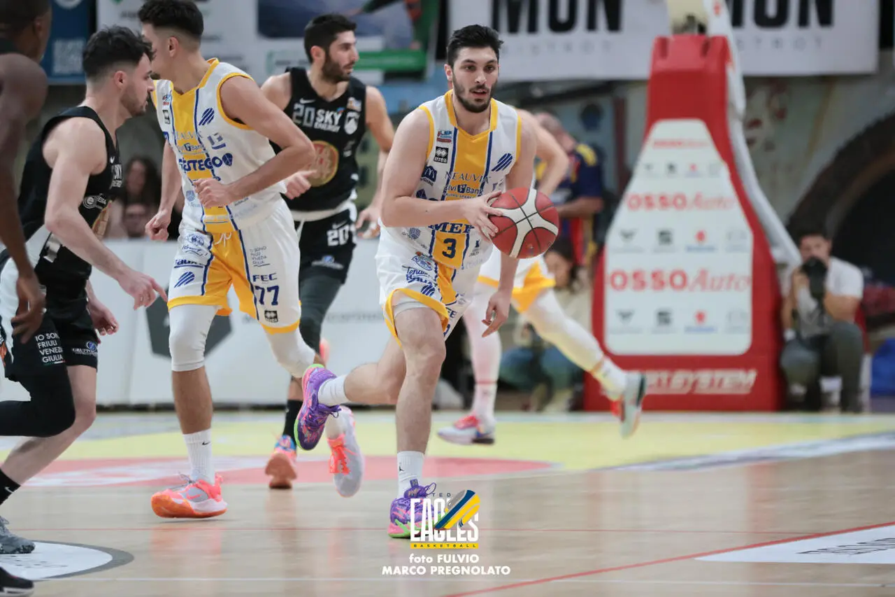 Pillastrini si affida in partenza a Rota, Redivo, Cole, Dell’Agnello e Berti mentre Vertemati risponde con Monaldi, Clark, Gaspardo, Alibegovic e Delia con i ducali subito molto reattivi sotto il canestro ospite e match in grande equilibrio (9-10 a 5’26”), perché Udine sfoggia sempre percentuali dall’arco stile NBA contro la vivacità dei padroni di casa e guadagna il primo allungo sul 9-15 a 4’10” dopo un’altra tripla di un’implacabile Monaldi e una penetrazione di Ikangi; le Aquile però non mollano e si riportano sotto con Miani e Dell’Agnello, con Udine che non si fa impressionare e mantiene 5 punti di vantaggio a 1’06” (20-25) dopo essersi portata sul +9 e chiude ancora avanti la prima frazione 23-29. Alla ripresa del gioco riprende il “bombardamento” e Udine vola sul +15 a 7’56” (23-38) sempre grazie al tiro dalla distanza azionato da un ottima circolazione della palla a cui la Gesteco non riesce a replicare sul fronte offensivo e Pillastrini chiama minuto per cercare di fermare l’inerzia; niente da fare, perché i suoi non riescono a trovare conclusioni pulite e devono attendere 4’51” dalla sirena di metà gara per smuovere il punteggio con un 1/2 ai liberi di Marangon (24-41) quando la gara è già compromessa e le squadre che vanno al riposo sul 33-53. Nel terzo quarto Udine non alza il piede dall’acceleratore, continua a macinare le sue soluzioni di gioco e costringe i gialloblù a viaggiare in apnea su parziali che si dilatano fino ai 30 punti di margine, anche perché in campo tra i ducali inizia a serpeggiare rassegnazione mentre sulle tribune continua incessante il tifo di casa come se nulla fosse successo. L’ultima frazione è utile solo ai fini statistici, perché stasera troppo è apparso il divario tra le due squadre anche solo per contenere il passivo, per un derby che va in archivio sul 59-92 finale per Udine e che è stato lontano parente dei precedenti solamente per un quarto di gara.
