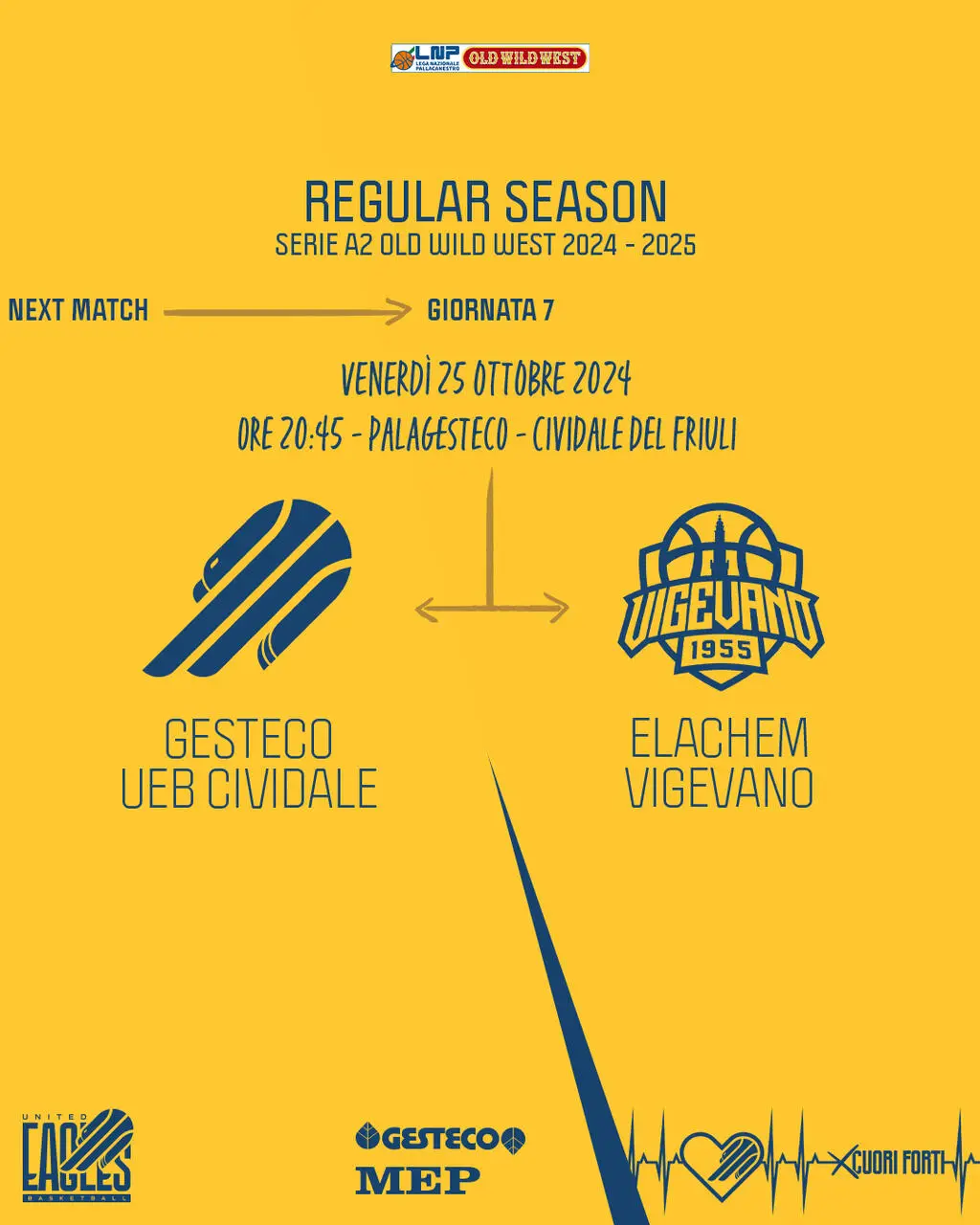 Venerdì 25 ottobre alle 20.45 la UEB Gesteco Cividale ospiterà tra le mura amiche del PalaGesteco l'Elachem Vigevano in occasione della settima giornata di Serie A2 Old Wild West. Arbitreranno la gara Valerio Salustri di Roma, Alex D'Amato di Tivoli (Roma) e Mirko Picchi di Ferentino (Frosinone).