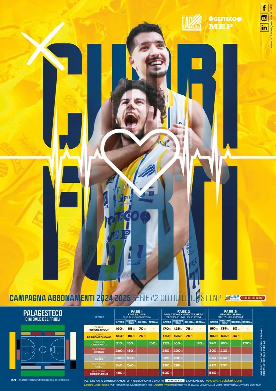 Prima "Travolgente". Poi "Tifo Cividale... e me ne vanto". Adesso "Per Cuori Forti". Il filo rosso che collega i tre slogan delle campagne abbonamenti delle Eagles è rappresentato dalla marea gialla che ha sempre risposto presente, riempiendo in un crescendo rossiniano le tribune del PalaGesteco. Prima per un anno in serie B e a seguire per due stagioni in serie A2. Proprio l'impianto di via Perusini sarà sottoposto nel corso dell'estate ad un restyling che lo renderà ancora più accogliente e, perché no, ancora più caldo. Questo è un regalo per tutti i tifosi delle Eagles e per tutta la comunità ducale che dai primi giorni di giugno potrà dimostrare il suo affetto alla UEB sottoscrivendo l'abbonamento per la stagione sportiva 2024-2025. Lo sanno anche i muri: al PalaGesteco c'è magia. Non resta che alimentarla. Facendo battere forte il cuore gialloblù dentro ognuno di noi.