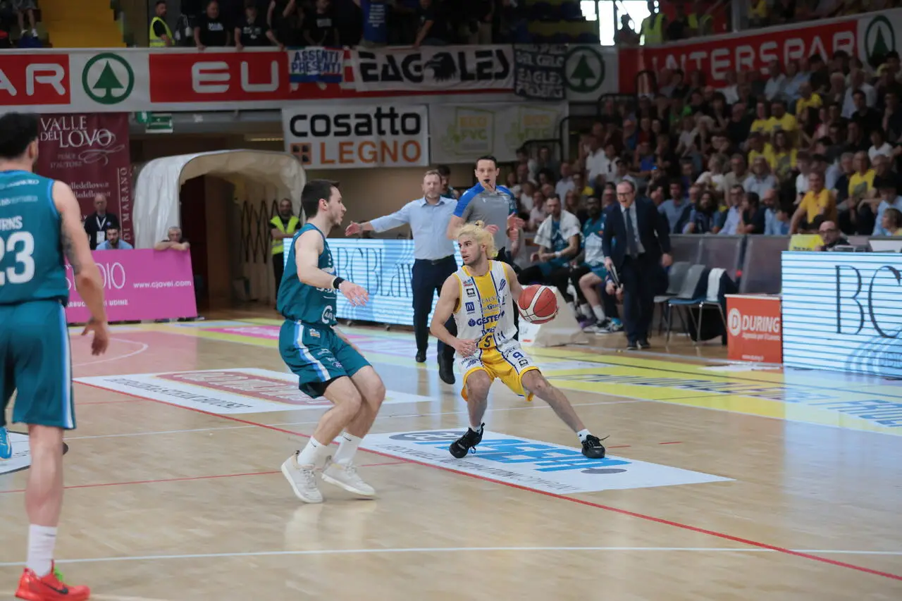 Pillastrini in partenza ripropone Rota, Redivo, Marangon, Dell’Agnello e Miani mentre Cagnardi risponde con i collaudati Hickey, Bucarelli, Nikolic, Baldi Rossi e Young in un ambiente elettrico che assiste ad un avvio all’insegna del perfetto equilibrio e il punteggio sul 7-6 dopo una tripla di Redivo a a 6’17” e Cividale subito a difendere a tutto campo ed entrambe le contendenti che litigano con il canestro; il tabellone segna 10-11 a 2’35” dopo un’altra tripla del Sindaco ed i due coach che rimescolano i quintetti e Cantù prova l’allungo portandosi sul + 6 (10-16), con il tempo che si chiude 15-19 perché Cividale ribatte nell’ultimo minuto della frazione. Si riparte e gli ospiti pigiano sull’acceleratore e vanno sul + 8 (15-23) a 8’05” e poi sul + 10 (18-28) anche grazie ad un metro arbitrale che agevola la difesa canturina ma la Gesteco non sbanda e con 4 punti consecutivi di Dell’Agello nel pitturato costringe Cagnardi a richiamare i suoi per un time out sul 22-28 a 4’55” dall’intervallo lungo; i suoi ripartono ancora di slancio e tornano sul + 9 (24-33) ma non riescono nell’intento di scappare via perché il cuore gialloblù batte ancora forte e in un amen i ducali tornano a – 4 (29-33) a 1’01”, fallendo poi il possesso del meno – 1, con gli ospiti abili e fortunati ad infilare rocambolescamente il 29-35 sulla sirena. La seconda parte del match si apre con Redivo che piazza la tripla del 32-35 subito però imitato da Young a stretto giro e poi inizia un botta e risposta dall’arco dove l’americano di Cantù spara a raffica e Gabriele Miani lo segue ed il tabellone sul 40-41 a 5’25 e Cividale con il possesso del possibile vantaggio che si tramuta nel pareggio con un uno su due di capitan Rota dalla lunetta (41-41); quando Cagnardi chiama ancora minuto dopo una palla persa dei suoi a 4’50”, il palazzo è una bolgia assordante e Rota replica prima con due liberi a segno per il 43-41 e poi con la tripla del 46-44. Cantù però vuole assolutamente evitare gara 5 e ci mette un attimo a rimettersi in parità con due liberi di Burns (46-46) a 3’15” dalla penultima sirena, a cui poi si arriva sul 51-55 perché i brianzoli sfruttano un gioco da 3 punti di Moraschini e fallisce l’ultimo tentativo dall’arco di Cividale.