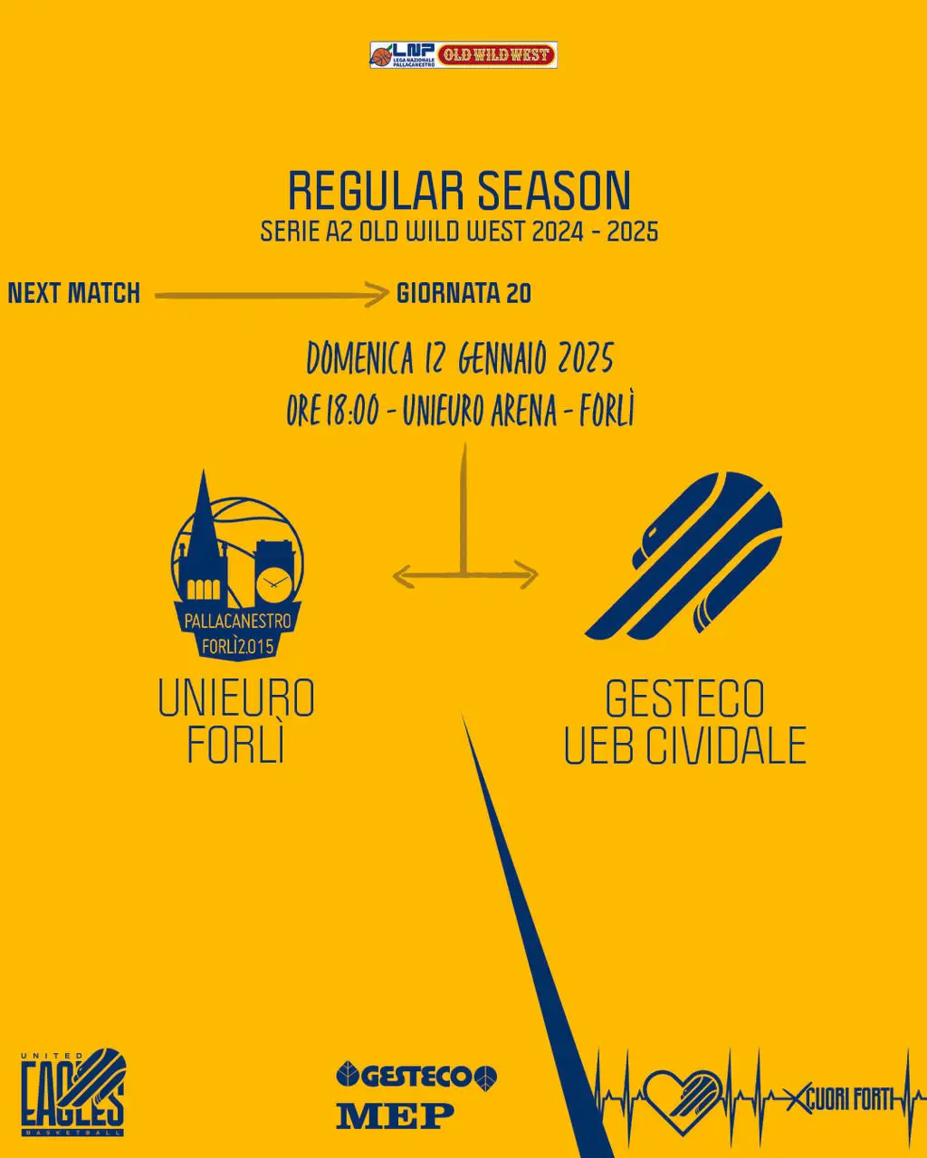 Domenica 12 dicembre alle 18 la UEB Gesteco Cividale sarà ospite della Unieuro Forlì, nella gara valida per la ventesima e prima giornata di ritorno di stagione regolare di Serie A2 Old Wild West. Arbitreranno Moreno Almerigogna di Trieste, Stefano De Biase di Treviso, Enrico Bartoli di Trieste.