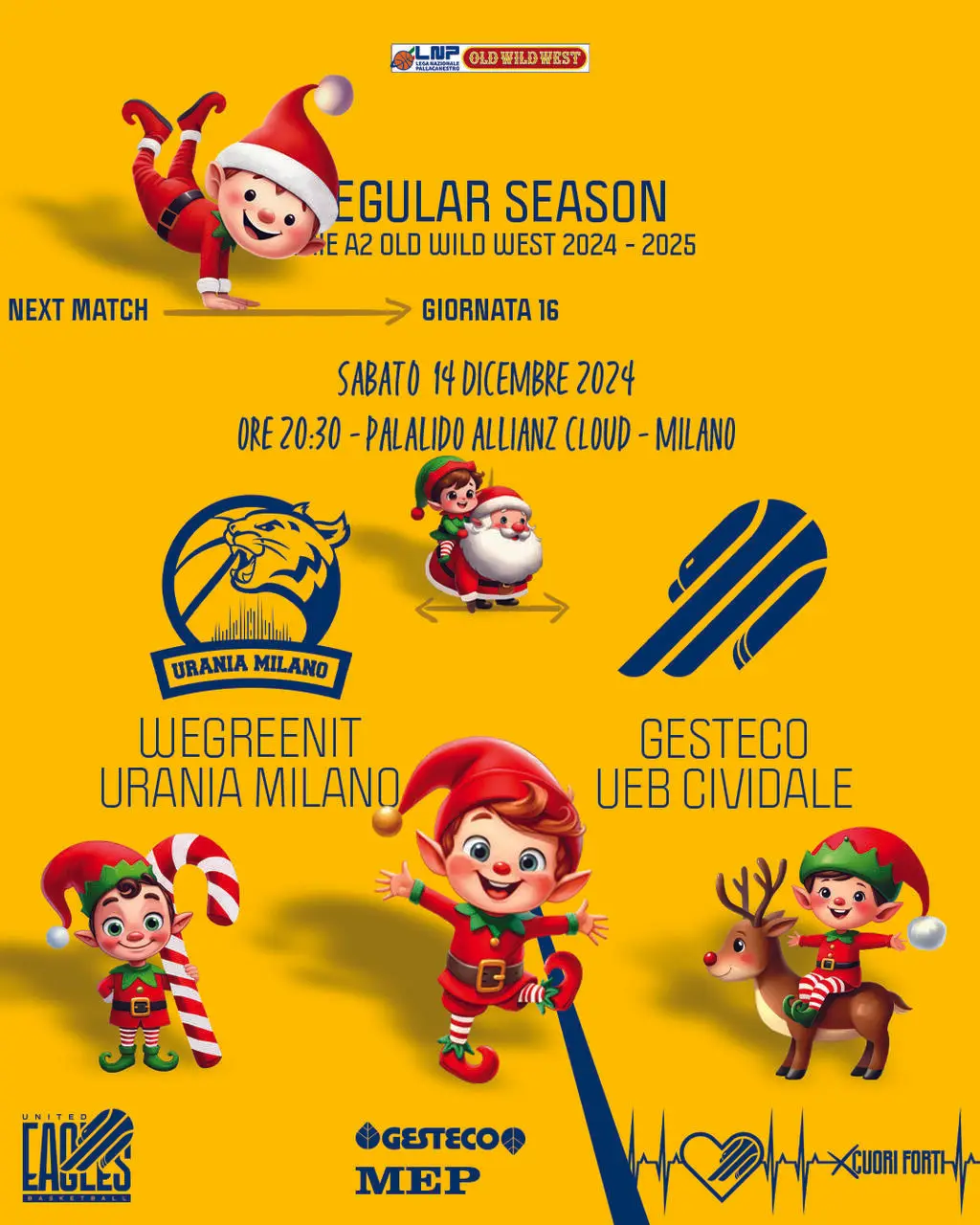 Sabato 14 dicembre alle 20.30 la UEB Gesteco Cividale sarà ospite della Wegreenit Urania Milano, nella gara valida per la sedicesima giornata d'andata di stagione regolare di Serie A2 Old Wild West. Arbitreranno Duccio Maschio di Firenze, Salvatore Nuara di Treviso e Lorenzo Lupelli di Roma.
