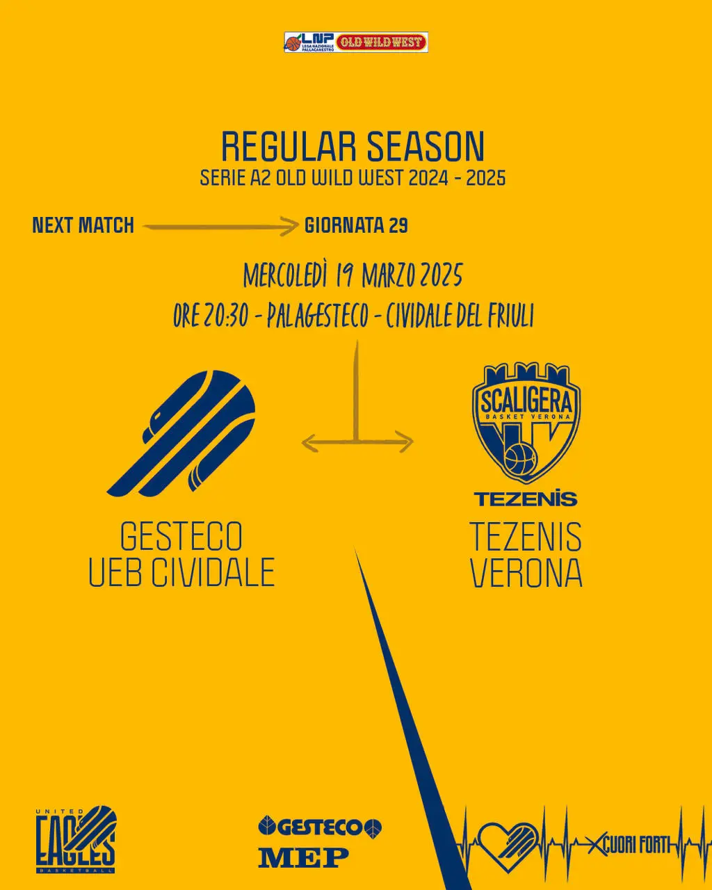 Mercoledì 19 marzo alle 20.30 la UEB Gesteco Cividale ospiterà in via Perusini la Tezenis Verona, nel recupero della ventinovesima e decima giornata di ritorno di stagione regolare di Serie A2 Old Wild West. Arbitreranno Stefano De Biase di Treviso, Lorenzo Lupelli di Roma e Simone Settepanella di Roseto degli Abruzzi.