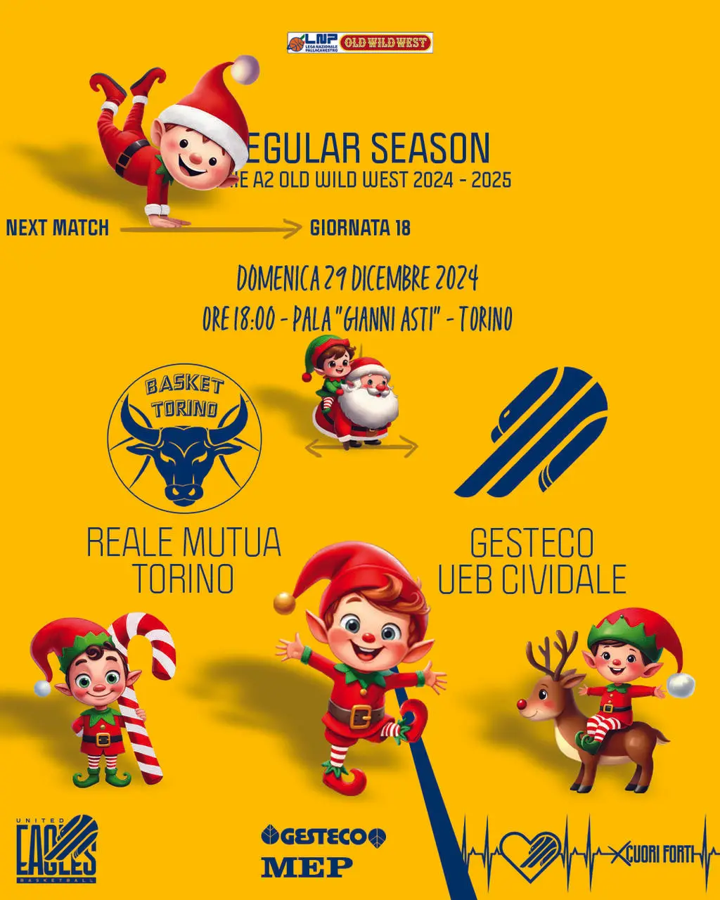 Domenica 29 dicembre alle 18 la UEB Gesteco Cividale sarà ospite della Reale Mutua Torino, nella gara valida per la diciottesima giornata d'andata di stagione regolare di Serie A2 Old Wild West. Arbitreranno Angelo Caforio di Brindisi, Calogero Cappello di Porto Empedocle (Agrigento) e Alex D'Amato di Tivoli (Roma).