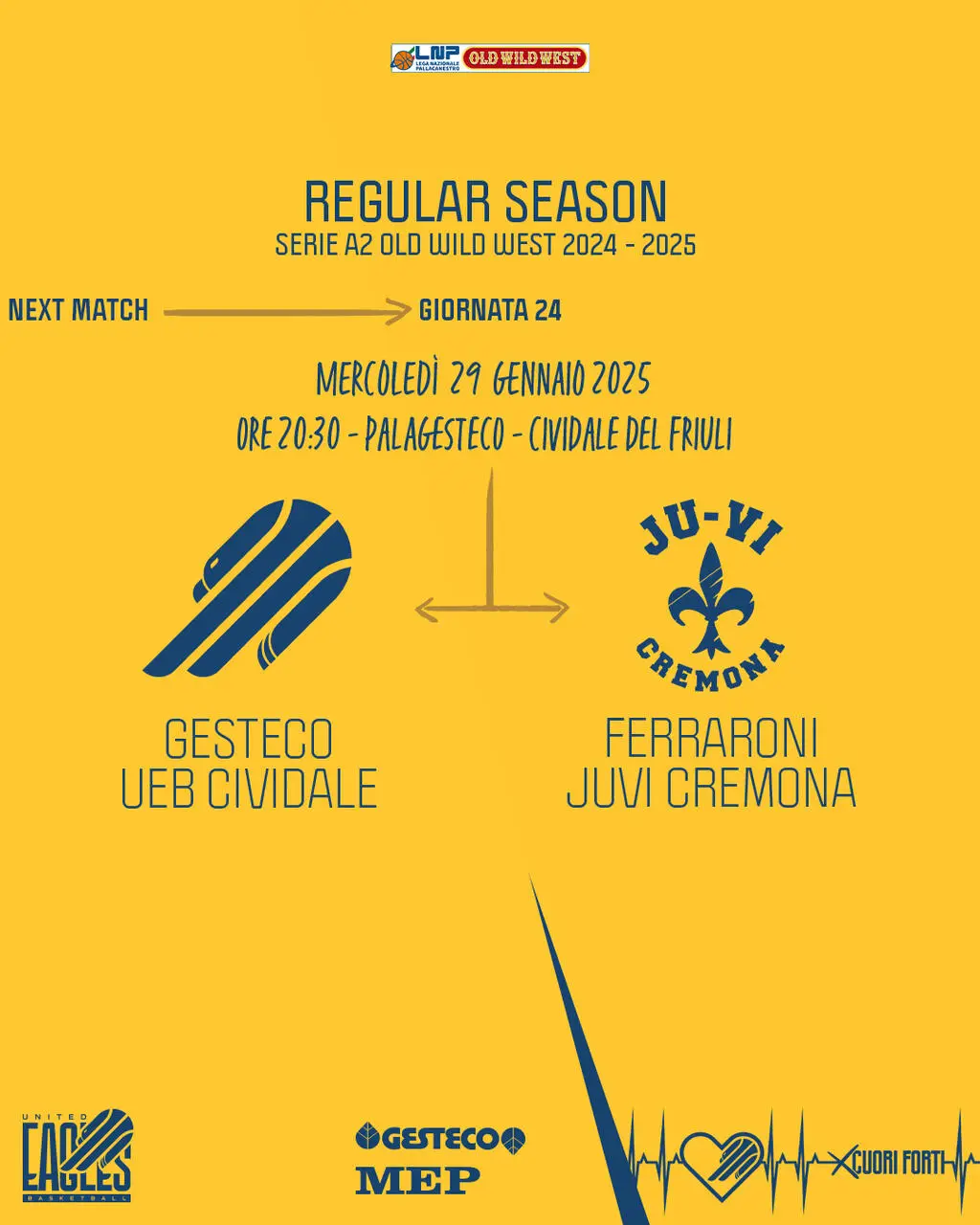 Mercoledì 29 gennaio alle 20.30 la UEB Gesteco Cividale ospiterà in via Perusini la Ferraroni Juvi Cremona, nella gara valida per la ventiquattresima e quinta giornata di ritorno di stagione regolare di Serie A2 Old Wild West. Arbitreranno Daniele Alfio Foti di Bareggio (Milano), Daniele Yang Yao di Vigasio (Verona) e Mauro Davide Barbieri di Roma.