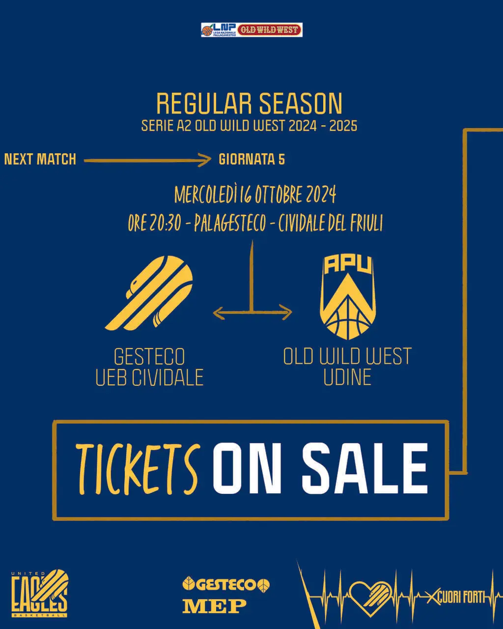 Domani, mercoledì 9 ottobre, si apre ufficialmente la prevendita per la quinta giornata di Serie A2 Old Wild West 2024/25, che si disputerà mercoledì 16 ottobre al PalaGesteco (palla a due alle 20.30) contro l'APU Old Wild West Udine.