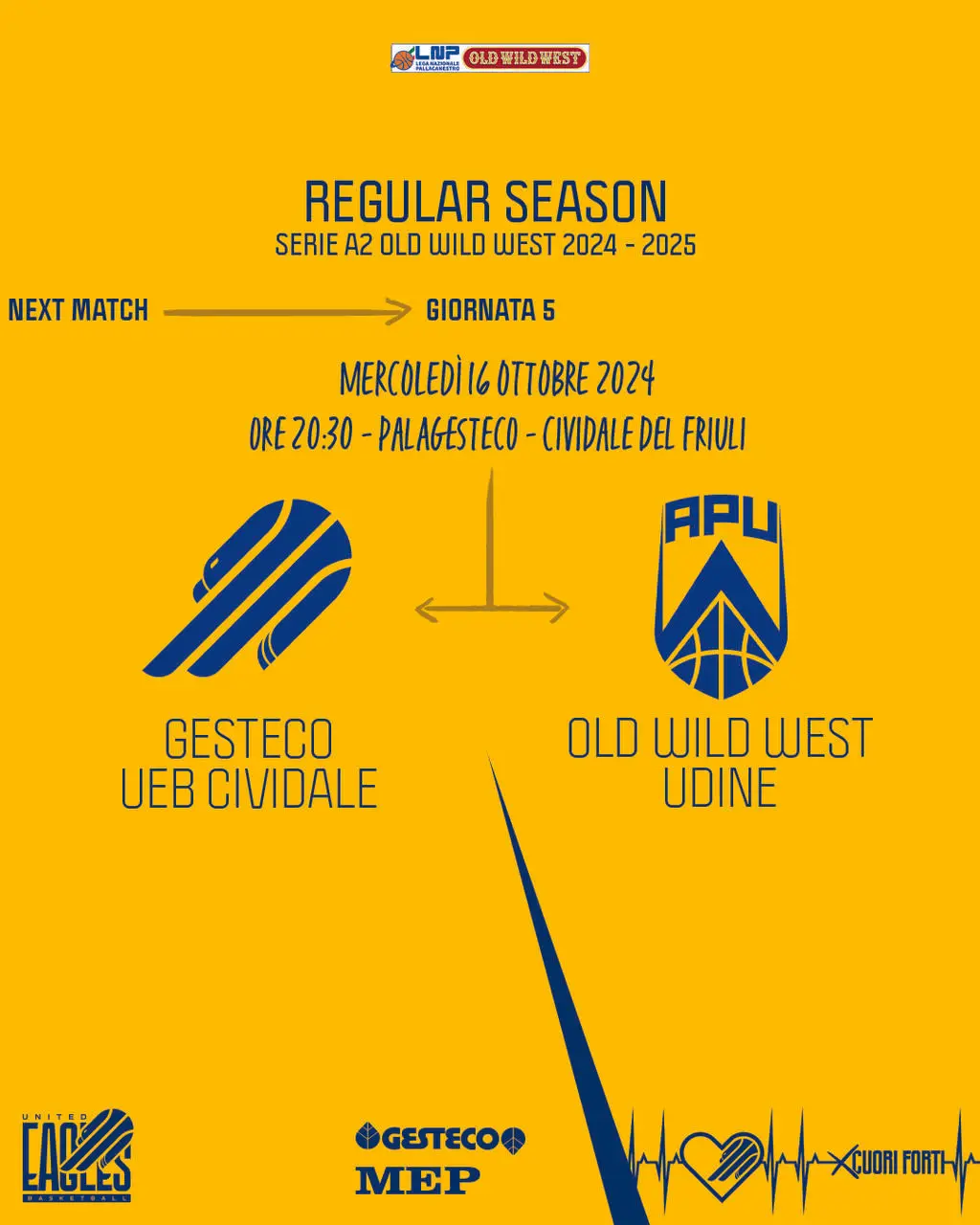 Mercoledì 16 ottobre alle 20.30 la UEB Gesteco Cividale attenderà tra le mura amiche del PalaGesteco l'APU OWW Udine in occasione della quinta giornata di Serie A2 Old Wild West. Arbitreranno la gara Angelo Caforio di Brindisi, Enrico Bartoli di Trieste e Sebastiano Tarascio di Priolo Gargallo (Siracusa).