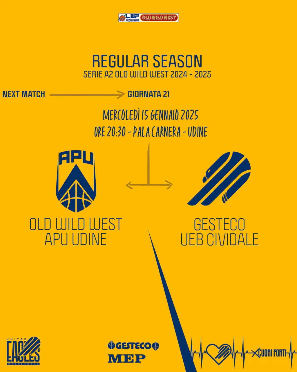 Mercoledì 15 gennaio alle 20.30 la UEB Gesteco Cividale sarà ospite dell'Apu Oww Udine, nella gara valida per la ventunesima e seconda giornata di ritorno di stagione regolare di Serie A2 Old Wild West. Arbitreranno Enrico Boscolo Nale di Chioggia (Ravenna), Stefano Wassermann di Trieste e Jacopo Pazzaglia di Pesaro.