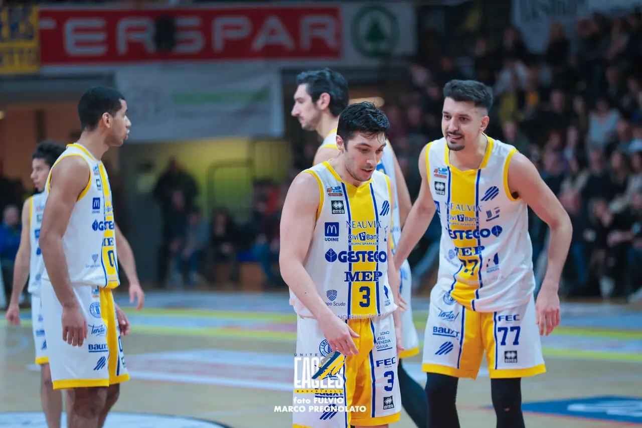 In avvio assieme a Lamb, che vince il ballottaggio dell’ultima ora con Cole, Cividale schiera Redivo, Mastellari, Dell’Agnello e Miani mentre Mecacci propone Mitchell, Bruttini, Moreno, Delfino e Archie e la Gesteco si porta subito sull’ 8-0 dopo una tripla dell’americano e del “sindaco” Redivo a 8’02” con il coach ospite a chiamare subito minuto per fermare la partenza a tutto gas dei ducali. La mossa non paga perché il gaucho al rientro infila altri 5 punti in un amen per il 13-2 che carica tutto l’ambiente verso la rincorsa e il tabellone che “vola” sul 20-7 dopo una tripla di Mastellari a 4’43” dalla prima sirena a cui si arriva sul 29-18 con la miglior prestazione offensiva stagionale in un quarto da parte dei gialloblù che hanno tiratosino a qui con il 50% dall’arco (7/14). Alla ripresa del gioco Pillastrini rimescola le carte con Rota, Isotta e Berti sul parquet e i suoi perdono le soluzioni offensive e subiscono anche la fisicità sotto canestro di Cento che si riporta sotto sul 29-24 a 7’32” con conseguente chiamata ai “box” da parte del tecnico di casa che rimanda in campo Redivo e Miani; si riprende con una tripla del capitano Rota ma ora il match è più equilibrato perché Cento fa salire le percentuali e Cividale fatica a trovare soluzioni con il “solito” Mussini si dimostra un fattore contro Cividale e piazzando 3 triple consecutive manda i suoi sul primo vantaggio (37-39) a 2’55” dall’intervallolungo; Cividale accusa il colpo e va sotto sul 37-44 prima che Marangon e Redivo rimettano in pista i ducali con due triple per il 43-44 che anticipano il 43-46 con cui si arriva a metà gara. Alla ripresa del gioco la Gesteco si presenta con gli stessi 5 di partenza e a 6’21” il punteggio certifica l’equilibrio in campo (50-51), con Cividale che si affida alle giocate di Redivo per rimanere incollata ai tentativi di allungo degli ospiti che sfruttano le doti di Archie e i punti di Bruttini nel pitturato per chiudere comunque avanti 58-61 alla penultima sirena. Gli uomini di Mecacci si dimostrano più pronti e cinici nel punire i gialloblù nel pitturato e vanno sul 60-68 a 5’50” dalla fine con i ducali che si aggrappano al loro fuoriclasse per restare nel match: sono due triple di Redivo che mettono il 69-70 a 4’15” e poi è Campani a siglare il 71-70 sempre sfruttando un assist del “Sindaco”. Il finale è, come tradizione vietato ai deboli di cuore, dove Mitchell sale in cattedra con due triple e il tabellone sul 75-76 a 2’00” dopo due punti di Dell’Agnello e 77-76 a 1’32” grazie all’ennesima magia di Redivo che induce Mecacci a chiamare i suoi per un minuto di sospensione. Mitchell castiga ancora i gialloblù alla ripresa e poi Archie segna una tripla siderale che vale il 77-81, mentre Lucio Redivo con il suo trentaduesimo punto fa sperare ancora Cividale con l’ultimo possesso per guadagnare l’overtime dopo l’1/2 di Mussini dalla lunetta che fissa il 79-82 a 11”. Il Gaucho si guadagna tre liberi, ma questa volta la mano fredda trema e fa 2/3 a 8” prolungando la suspense e mettendotutto ancora in discussione. Mussini si presenta di nuovo in lunetta e non sbaglia (81-84). Altro giro per Redivo dalla linea della carità ma poi sono gli ospiti in contropiede a mettere la parola fine alla combattutissima contesa.