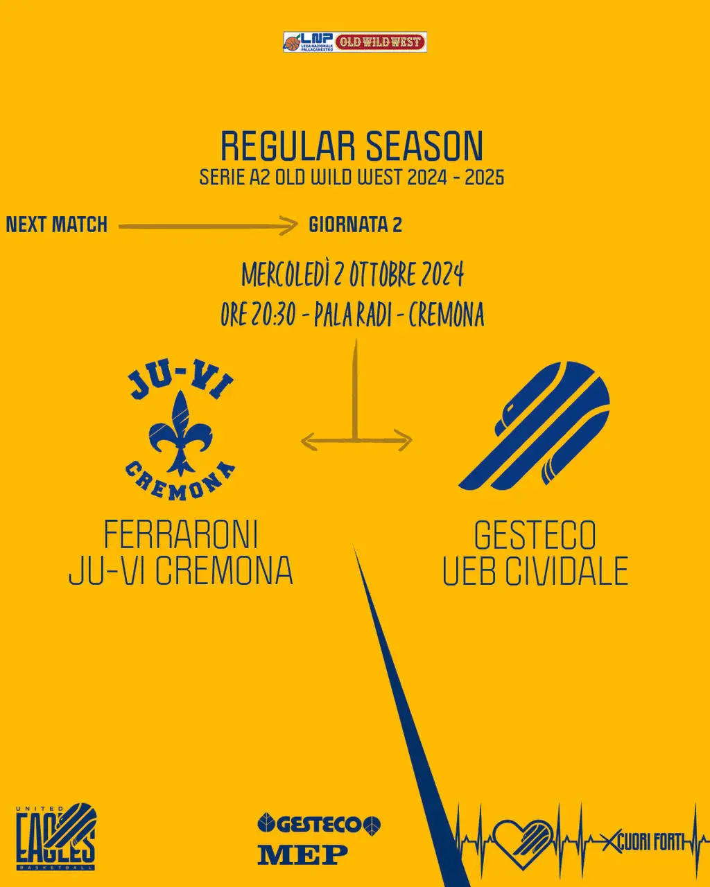 Mercoledì 2 ottobre è già tempo del primo degli otto turni infrasettimanali di questo lungo campionato di serie A2 OWW: la UEB Gesteco Cividale si trasferisce a Cremona per una sfida importantissima al PalaRadi contro la Juvi Ferraroni. Arbitri Michele Centonza di Grottammare, Luca Bartolini di Fano e Andrea Cassinadri di Bibbiano.