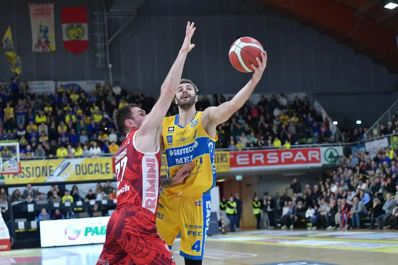 Al ritorno in campo Marini riporta in pari la contesa dall’arco e poi Simon Anumba dà il primo vantaggio a Rimini con Redivo commette il terzo fallo e Marini dalla lunetta allunga sul 40-44; l’impatto degli ospiti nel periodo è decisamente diverso con un Marini “on fire” e il coach ducale deve chiamare minuto a 6’21” sul 44-49 e palla in mano ai romagnoli. L’inerzia del match è cambiata perché i gialloblù hanno perso la fluidità iniziale e faticano a trovare buone conclusioni e perso intensità in difesa, mentre Rimini viaggia spedita sul +10 (48-50 a 2’55”) avendo inflitto un parziale di 8-18 guidata da Johnson e Marini. Il tabellone alla penultima sirena segna 55-63, con Johnson che ricaccia allo scadere a –8 il tentativo di rimonta gialloblù mettendo a segno il suo punto numero 16 da centro area.