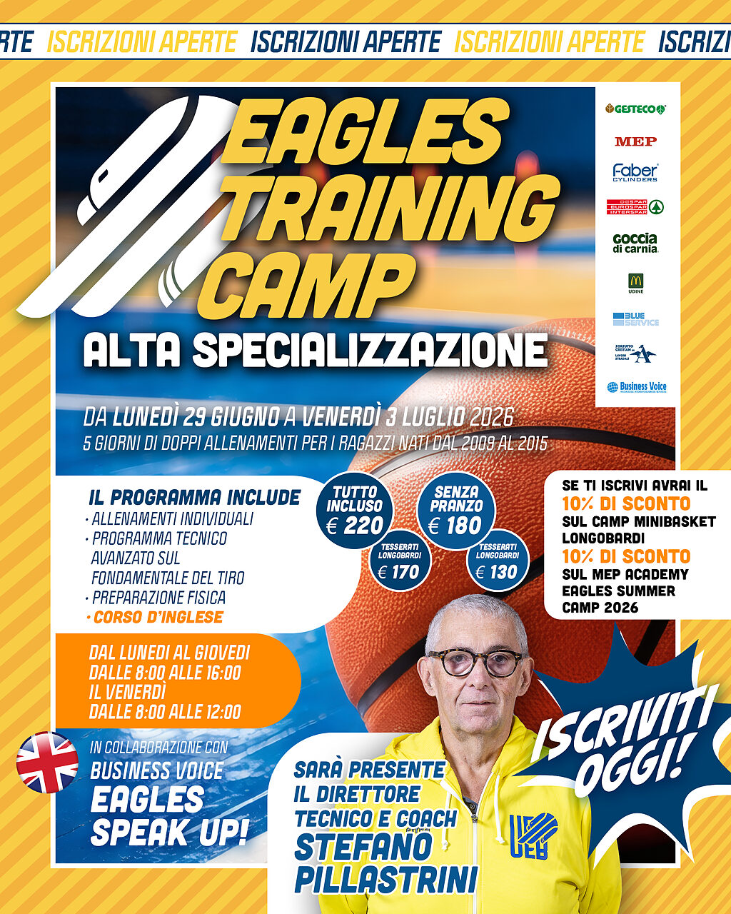 Il programma è pensato per offrire un’esperienza completa, dentro e fuori dal campo. Oltre al lavoro tecnico sui fondamentali e agli allenamenti individuali e di squadra, i partecipanti prenderanno parte anche al corso di inglese “Eagles speak up!”, realizzato in collaborazione con il nostro partner Business Voice con l'obiettivo di garantire ad ogni atleta una settimana di alta formazione a 360 gradi.
